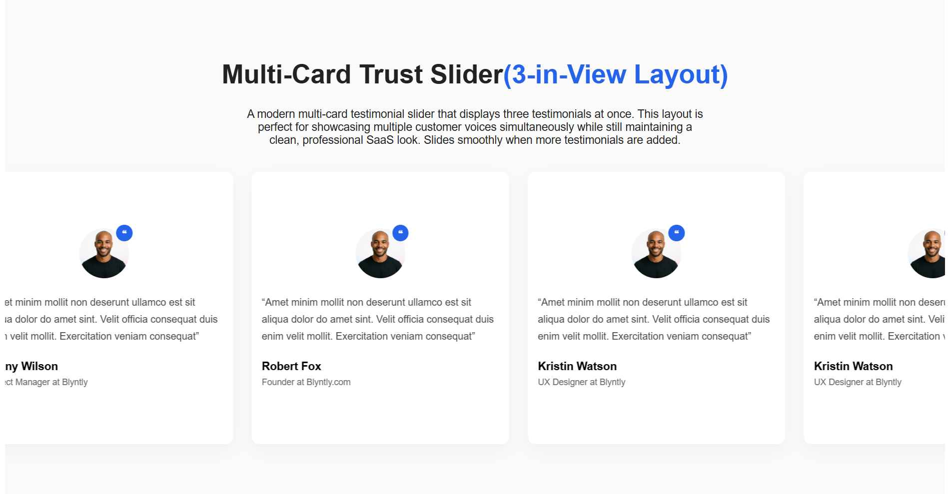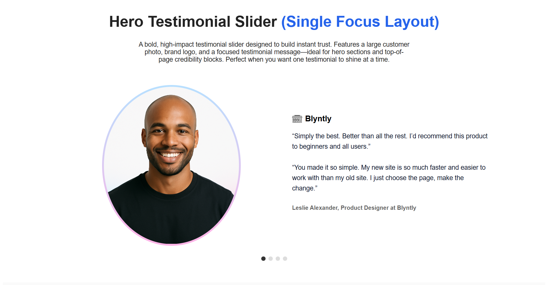 This slider saves you hours of development time and instantly enhances your website’s credibility with a premium testimonial layout.